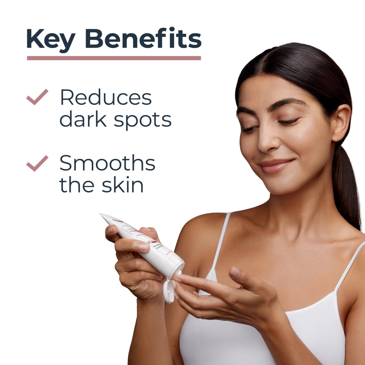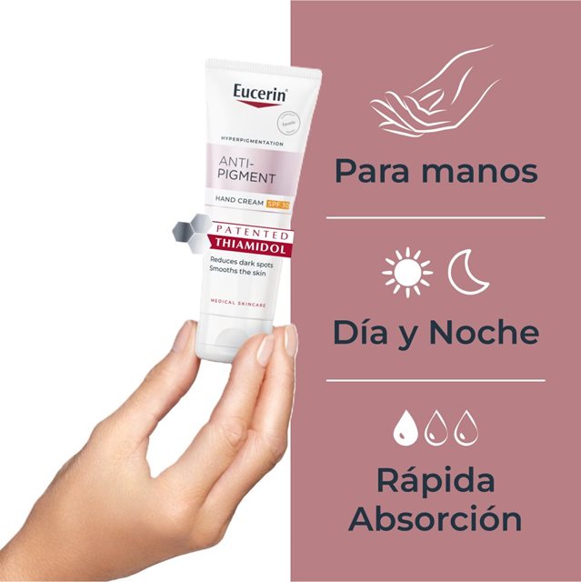La pigmentación de la melanina es producida por los Melanocitos que dan color a la piel y es la propia de nuestra piel para proteger de los rayos UV. Sin embargo, la sobre-producción de Melanina y su distribución desigual genera manchas de hiperpigmentación en la piel. Para reducir la apariencia de manchas y prevenir su reaparición, creamos Eucerin Anti-Pigment Crema de Manos. La crema se absorbe fácilmente y también es extremadamente efectiva para la hidratación de la piel, dándole una sensación hidratada durante todo el día. Eucerin Anti-Pigment Crema de Manos contiene Thiamidol, un ingrediente efectivo y patentado que actúa en la raíz de la causa de la hiperpigmentación a través de la reducción de producción de melanina. Está clínica y dermatológicamente probado que reduce manchas y previene su reaparición. Primeros resultados visibles después de dos semanas y mejora continuamente con uso regular. Con filtros UVA y UVB (FPS 30) la crema correctora ofrece protección solar efectiva y reduce las posibilidades de que la piel genere manchas causadas por el sol. Las manchas de las manos se reducen visiblemente y la piel se ve pareja y radiante.