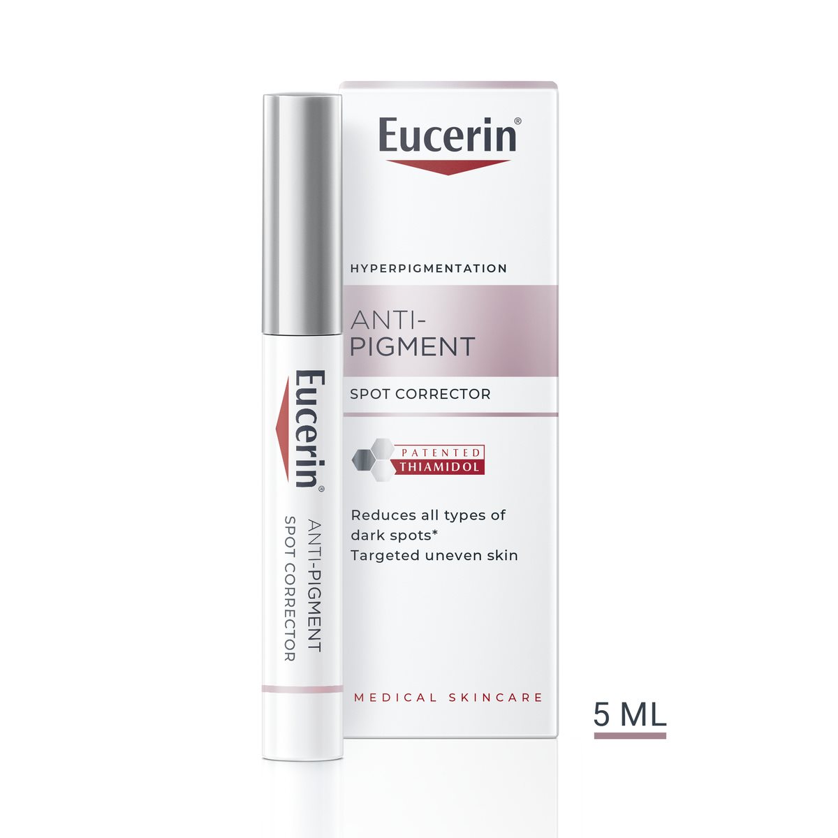 Eucerin Anti-Pigment Spot Corrector es un gel no graso con un aplicador tópico que facilita la aplicación precisa a pequeñas áreas de hiperpigmentación. Contiene Thiamidol®, un ingrediente efectivo y patentado que actúa como la causa principal de la hiperpigmentación al reducir la producción de melanina. Se aplica directamente a las manchas oscuras, está clínica y dermatológicamente probado para reducirlas y prevenir su reaparición. Los primeros resultados son visibles después de dos semanas y mejoran continuamente con el uso regular. La piel es visiblemente más uniforme.