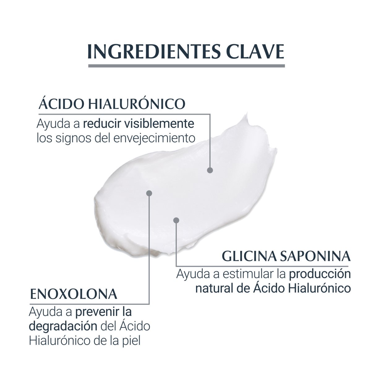 La mezcla única de Eucerin de Ácido Hialurónico de alto y bajo peso molecular, Saponina de Glicina y Enoxolona proporciona un enfoque específico para ayudar a rellenar visiblemente incluso las arrugas más profundas. El Ácido Hialurónico de alto peso molecular mejora la hidratación y alisa las capas más externas de la piel, mientras que el Ácido Hialurónico de bajo peso molecular, que es 40 veces más pequeño1, penetra más en las capas epidérmicas de la piel, donde se originan las arrugas más profundas. El Antioxidante Glycine Saponin favorece la producción de Ácido Hialurónico en la capa dérmica y protege de los radicales libres. La Enoxolona protege el Hialurón propio de la piel de la degradación.