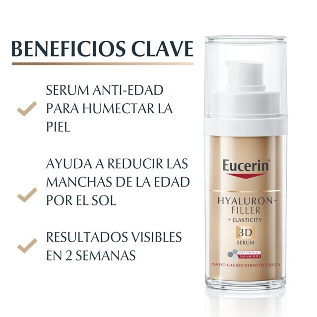 Se ha demostrado clínica y dermatológicamente que Eucerin Hyaluron-Filler + Elasticity 3D Serum ayuda a reducir las manchas de la edad, rellenar visiblemente las arrugas, mejorar la elasticidad y dejar la piel con un aspecto radiante y rejuvenecido.